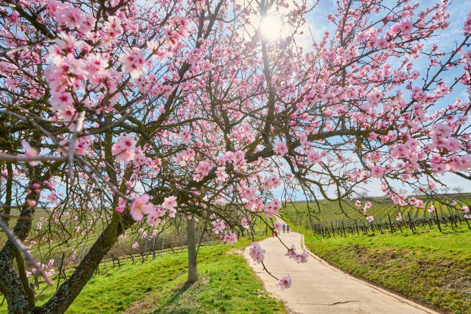 Erleben Sie die Weinregion Pfalz, eingetaucht in ein Blütenmeer der Mandelbäume.
